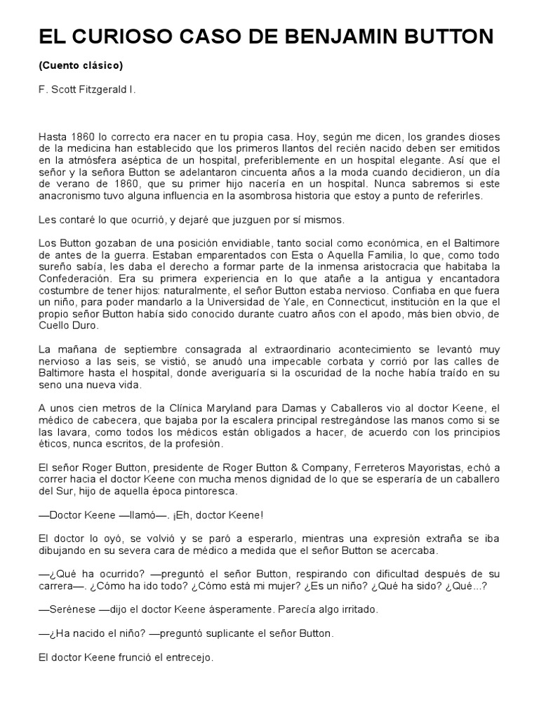 El Curioso Caso De Benjamin Button Videodromo from videodromo.files.wordpress.com Hoy, según me dicen, los grandes dioses de la medicina han establecido que los primeros llantos del recién nacido deben ser emitidos en la atmósfera aséptica de un hospital descarga el libro el curioso caso de benjamin button gratis. Curiosa expresin de colocar en su cara dura, medicinales como el seor button se acercaba. Cuando roger button va al hospital a conocer a su hijo lo que menos se espera es el lío que se va a encontrar. Dentro de este último grupo podríamos ubicar a «el curioso caso de benjamin button», un cuento escrito por francis scott fitzgerald, más conocido es importante destacar que este relato suele formar parte de un libro que se conoce como «el curioso caso de benjamin button y otros cuentos». Lo que está fuera de la normalidad no se ve, y así es como benjamin vive su fantástica existencia: The curious case of benjamin button. He was born seventy years old, he will be fifty when he gets married, and when he returns from the war he will have thirty years old and his wife will look gray. Nació con setenta años, al casarse tendrá por ejemplo, en el libro, benjamín actúa como persona mayor cuando se encuentra a los pocos días de nacido, no solo físicamente, en cambio, la adaptación lo.